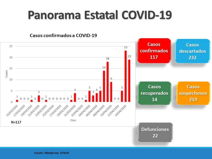 La Secretaría de Salud del Gobierno del Estado informó que al 15 de abril del 2020, se tienen en Chihuahua un total de 117 casos confirmados de COVID-19 y el número de fallecimientos aumentó a 22.