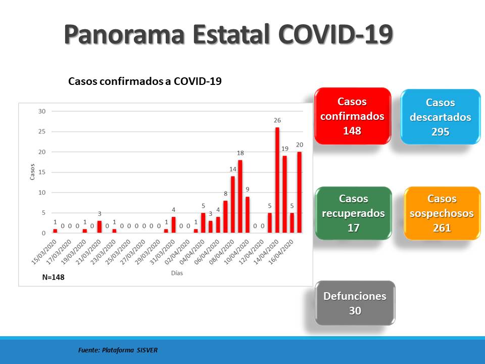 Chihuahua.- A 30 se elevó el número de personas muertas por coronavirus en el estado, mientras que el número de contagiados confirmados con Covid-19 subió a 148, además de que los municipios de Ahumada y Valle de Guadalupe se suman a los 10 en los que ya había personas afectadas por la pandemia.