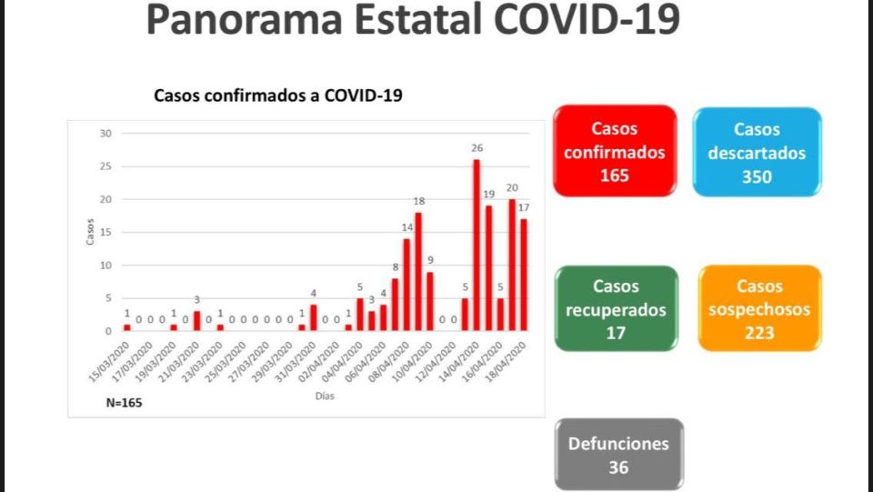 Chihuahua.- De acuerdo al reporte estadístico sobre el avance de la pandemia de coronavirus en Chihuahua dado a conocer hoy por autoridades del sector salud, se elevó a 36 el número de decesos, mientras que el de personas contagiadas por el Covid-19 subió a 165.