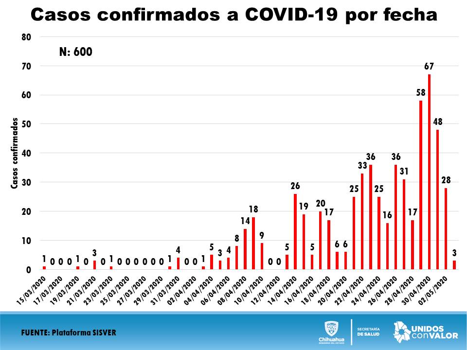 Chihuahua.- En Chihuahua, los siguientes 15 días se consideran clave para contender la pandemia de coronavirus, mismo que al día de hoy, de acuerdo a reportes de personal de la Secretaría de Salud se tienen confirmados 600 casos de Covid-19, 400 de ellos en Ciudad Juárez y 155 en la ciudad de Chihuahua, así como 98 decesos.