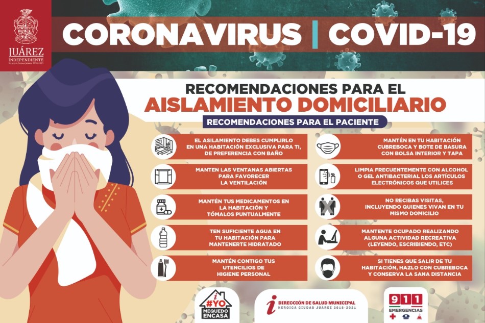 Ciudad Juárez.- A través de la Dirección de Salud el gobierno local emitió una serie de recomendaciones para el aislamiento domicilio, dirigidas específicamente a pacientes confirmados o sospechosos de padecer Covid-19, a fin de evitar la dispersión del Coronavirus.