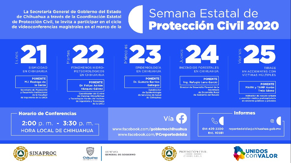 Chihuahua.- Ante la pandemia de Covid-19, las actividades contempladas en la conmemoración de la Semana Estatal de Protección Civil que se celebra del 21 al 25 de septiembre, serán de manera virtual.