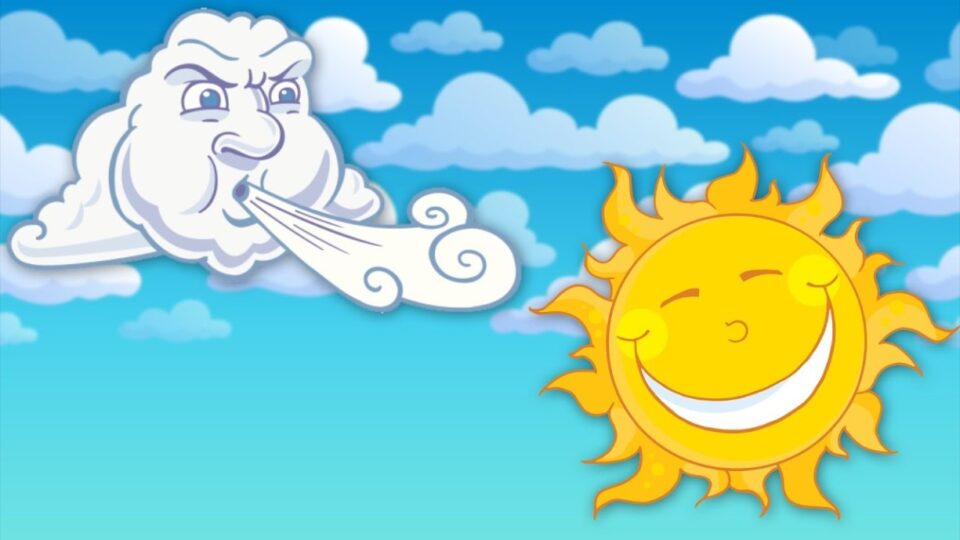 El sol y el viento discutían sobre cuál de dos era más fuerte. La discusión fue larga, porque ninguno de los dos quería ceder. Viendo que por el camino avanzaba un hombre, acordaron en probar sus fuerzas utilizándolas contra él.