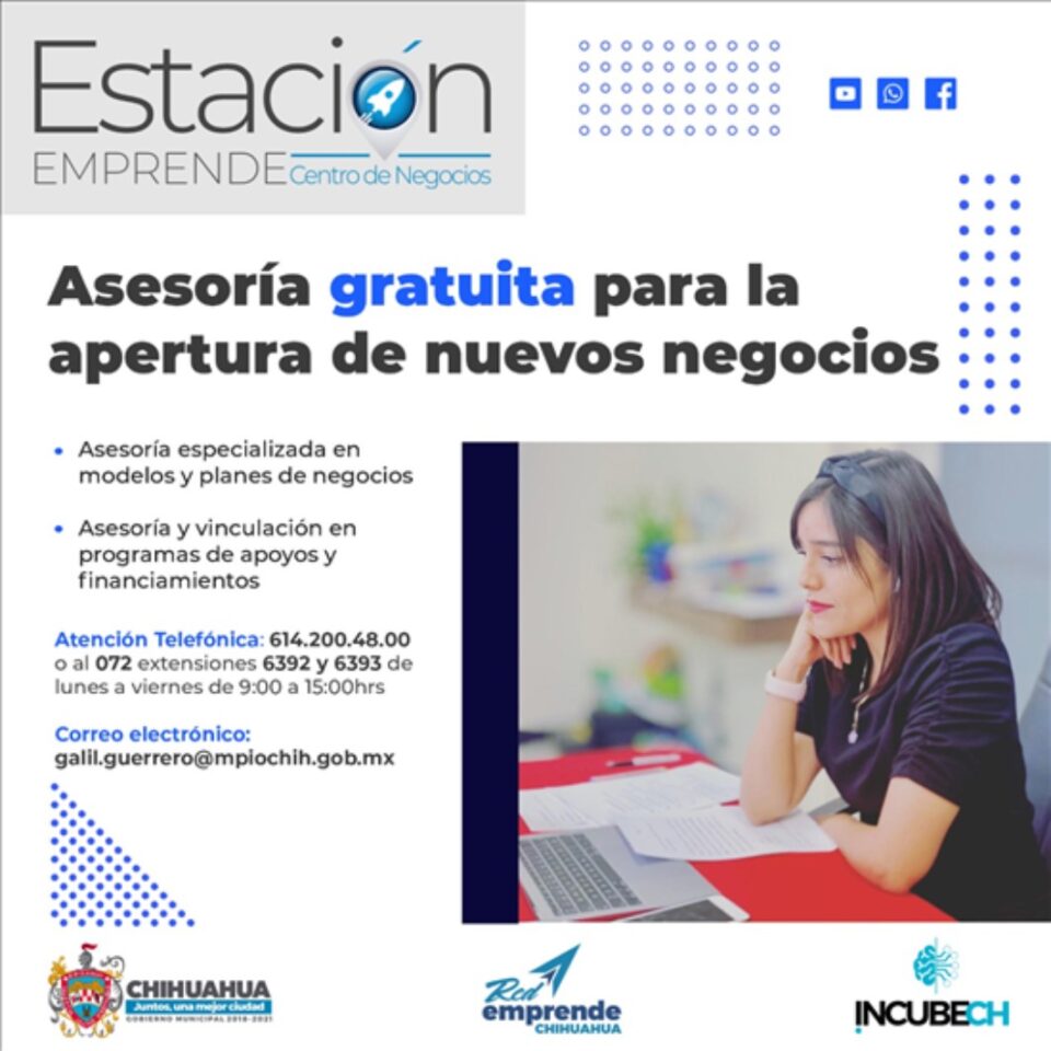 Chihuahua.- Con el fin de seguir ofreciendo a la ciudadanía los servicios del Centro de Negocios Estación Emprende, el Gobierno Municipal pone a disposición de los interesados distintos canales de comunicación a distancia, para brindar apoyo en los siguientes rubros: