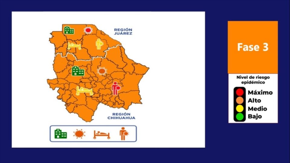 Chihuahua.- Ante el constante incremento de contagios y muertes por Covid-19, la Secretaria de Salud anunció que a partir del próximo lunes 29, Chihuahua regresa al color naranja en el semáforo epidemiológico, con las restricciones de movilidad y actividades económicas y sociales que ello implica.