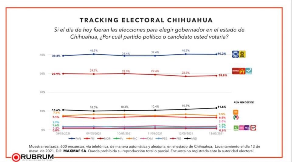 Ciudad Juárez.- La empresa encuestadora Rubrum reveló su encuesta quincenal rumbo a la gubernatura 2021 donde fueron encuestados 600 personas a las cuales se le cuestionó a cada uno con la siguiente pregunta; “Si el día de hoy fueran las elecciones para elegir gobernador en el estado de Chihuahua, ¿Por cuál partido político o candidato votaría usted?