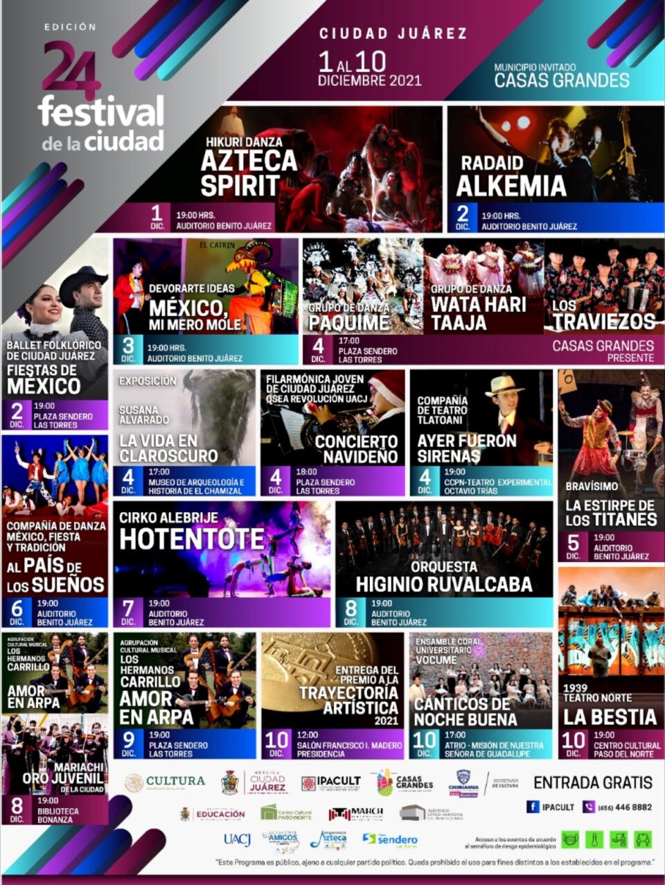 Ciudad Juárez.- Un total 19 actividades artísticas de alta calidad son las que a partir de este miércoles y hasta el próximo 10 de diciembre se estarán presentando en el marco de la vigésima cuarta edición del Festival de la Ciudad, evento que contará con la participación de artistas de Casas Grandes como municipio invitado.