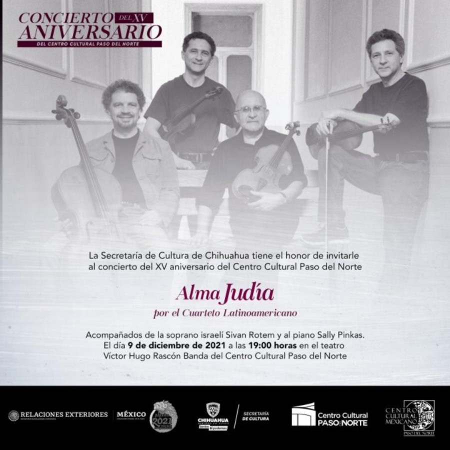 Ciudad Juárez.- Con el mago concierto “Alma Judía”, a cargo del reconocido Cuarteto Latinoamericano acompañado por la soprano israelí Sivan Rotem y al piano Sally Pinkas, el Centro Cultural Paso del Norte, celebra sus XV años.
