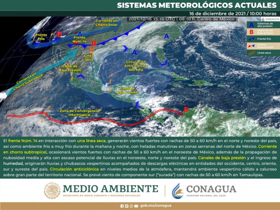 De acuerdo con el pronóstico del Servicio Meteorológico Nacional, un vórtice de núcleo frío llega acompañado por el Frente Frío número 14, que se mantendrá posicionado en la zona fronteriza entre México y Estados Unidos.