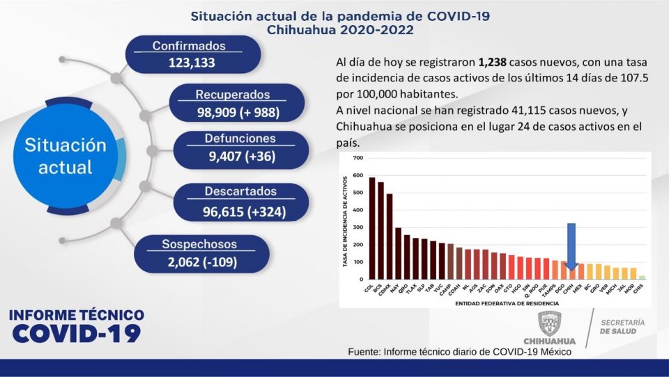 Chihuahua.- Treinta y seis chihuahuenses más se sumaron en las últimas 24 horas a las estadísticas de quienes han perdido la vida por Covid-19, mientras que otros 1 mil 238 más fueron confirmados con Coronavirus, casos con los que se llega a un acumulado estatal de 123 mil 133 contagiados, de los que han derivado 9 mil 407 decesos.