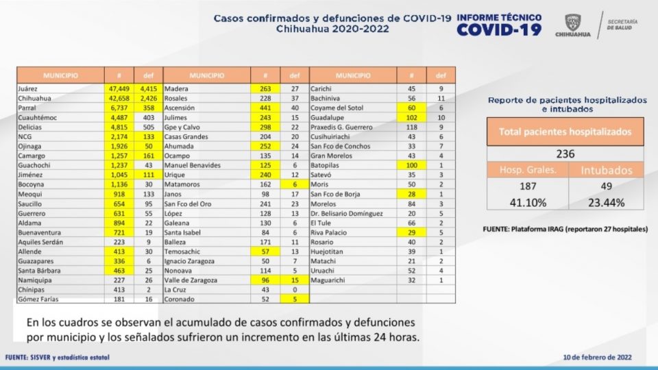 De acuerdo al informe de la Secretaría de Salud correspondiente a este jueves 10 de febrero, de las 38 muertes confirmadas de ayer a hoy, 17 se registraron en Ciudad Juárez, nueve en la ciudad de Chihuahua, cuatro en Camargo, dos en Nuevo Casas Grandes y una en los municipios de Parral, Ojinaga, Jiménez, Matamoros, Valle de Zaragoza y Coronado.