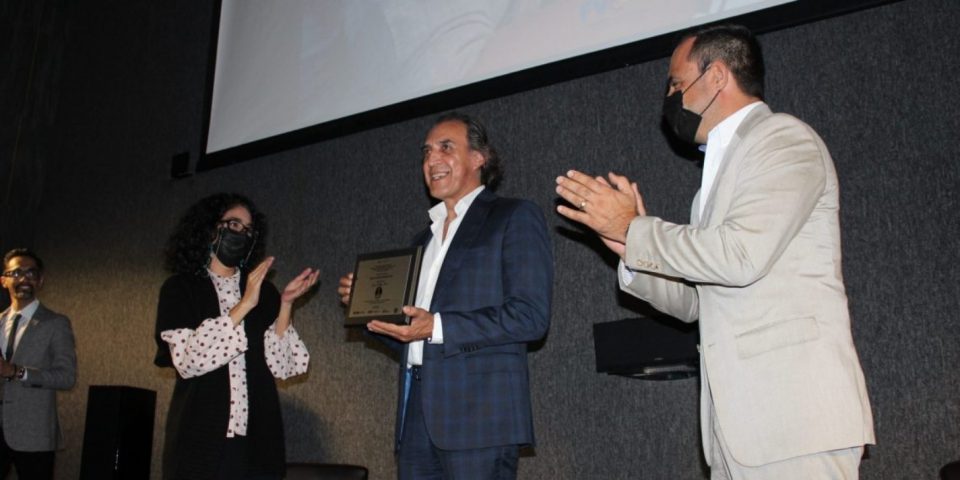 A nombre del maestro Juan Ignacio Camargo Nassar, rector de la UACJ, Alpha Elena Escobedo Vargas, directora general de Difusión Cultural y Divulgación Científica de esta institución, entregó una placa de reconocimiento al actor poblano, ganador de una Diosa de Plata y de tres premios Ariel que otorga la Academia Mexicana de Artes y Ciencias Cinematográficas (AMACC).