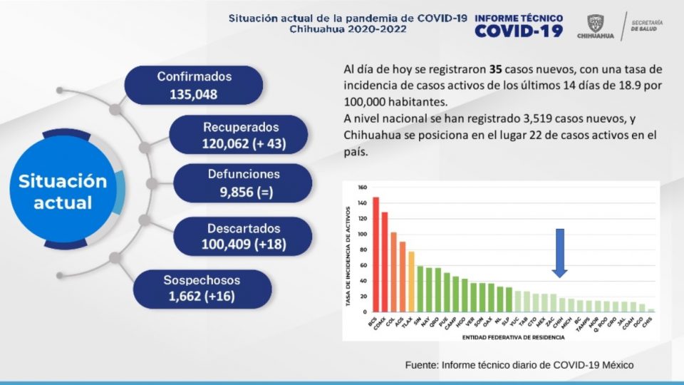 Chihuahua permanece en el lugar número 22 en casos activos de Covid-19 en el país con una tasa de incidencia de 18.9 casos por cada 100 mil habitantes.
