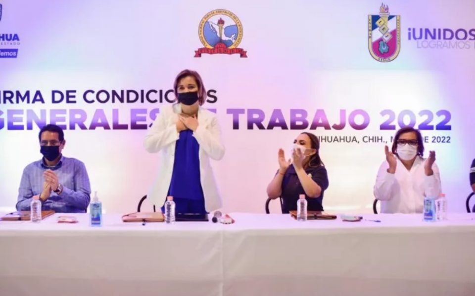 Chihuahua.- Durante los festejos por el Día del Trabajo, la gobernadora María Eugenia “Maru” Campos Galván, oficializo un incremento del 5 por ciento a la burocracia estatal y mejoras en prestaciones, de acuerdo al pliego petitorio del Sindicato de Trabajadores al Servicio del Gobierno del Estado (STSGE).