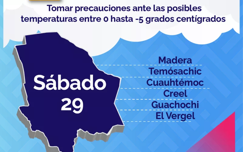 Con base a la información emitida por el Servicio Meteorológico Nacional (SMN), la CEPC indica que para el amanecer del viernes se esperan valores mínimos de 0°C, con potencial presencia de heladas en la comunidad de El Vergel municipio de Balleza y temperaturas entre 0 y -3°C en los municipios de Temósachic, Creel, Guachochi, Janos, Madera, y Cuauhtémoc. En el resto de la entidad, se estima que el termómetro marque entre 6 y 12°C.