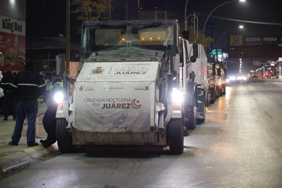 Ciudad Juárez, Chih.- Durante la Cruzada Nocturna que se realizó en el corredor Paseo Triunfo de la República, personal del Gobierno Municipal 2021-2024, recogió 1.5 toneladas de basura, dio mantenimiento a 185 luminarias y procedió a la poda de árboles de la zona atendida.