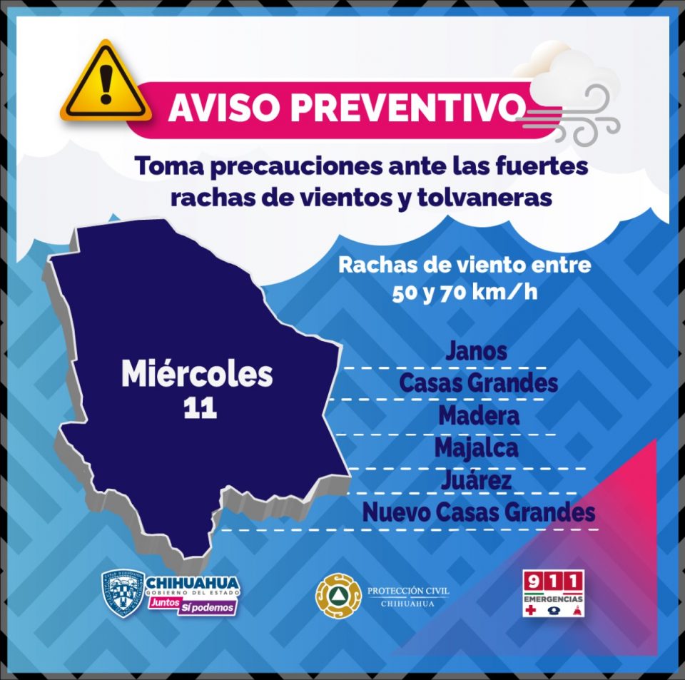 Para el miércoles 11 de enero, se espera que por la tarde se incremente considerablemente la velocidad del viento, con rachas que pueden oscilar entre 50 y 70 km/h en municipios de Janos, Casas Grandes, Madera, el norte de Chihuahua, Juárez y Nuevo Casas Grandes.