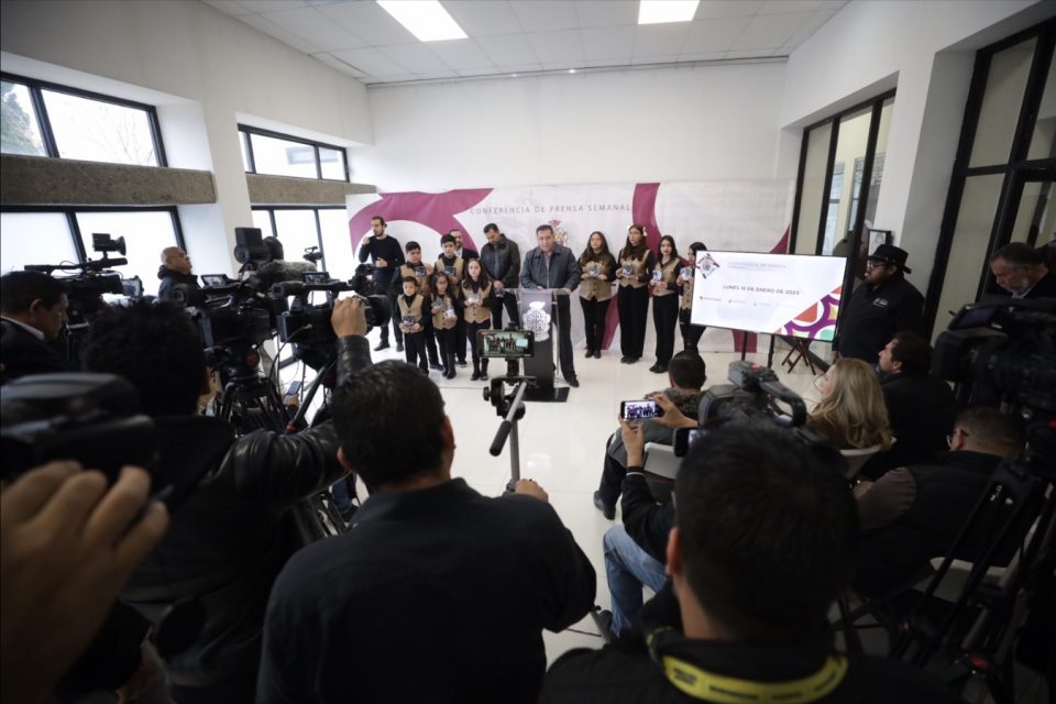Durante el desarrollo de la rueda de prensa que encabeza el alcalde todos los lunes en el Museo de Arqueología e Historia de El Chamizal, los niños le desearon un feliz cumpleaños cantándole en vivo.