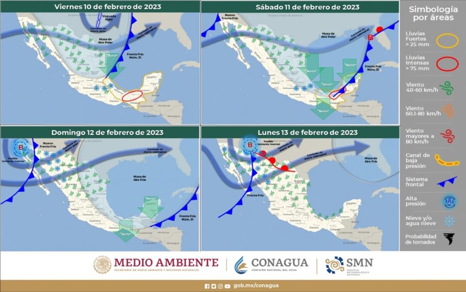 Mientras que para el domingo 12 de febrero, se pronóstica de esta manera (máximas /mínimas °C): Chihuahua 23/6, Juárez 21/5, Janos 21/1, Madera 15/0, Temósachic 17/-2, Cuauhtémoc 18/3, Ojinaga 22/7, Delicias 22/6, Camargo 23/5, Jiménez 23/4, Parral 22/4, Creel 13/0, Chínipas 25/11, Guachochi 14/2, El Vergel 14/0.