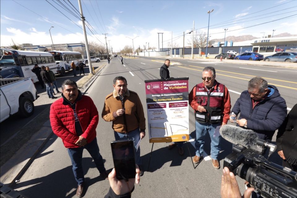 Ciudad Juárez, Chih.- Con una inversión cercana a los once millones de pesos, se realizó la rehabilitación de más de 30 mil metros cuadrados de pavimento, en dos tramos de la avenida Hermanos Escobar, trabajos que fueron entregados a la comunidad por el alcalde, Cruz Pérez Cuéllar.