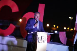 El alcalde, Cruz Pérez Cuéllar, acompaño al director ejecutivo de la Junta Municipal de Agua y Saneamiento (JMAS), Sergio Nevárez Rodríguez al evento de iluminación de la plaza de la Mexicanidad.
