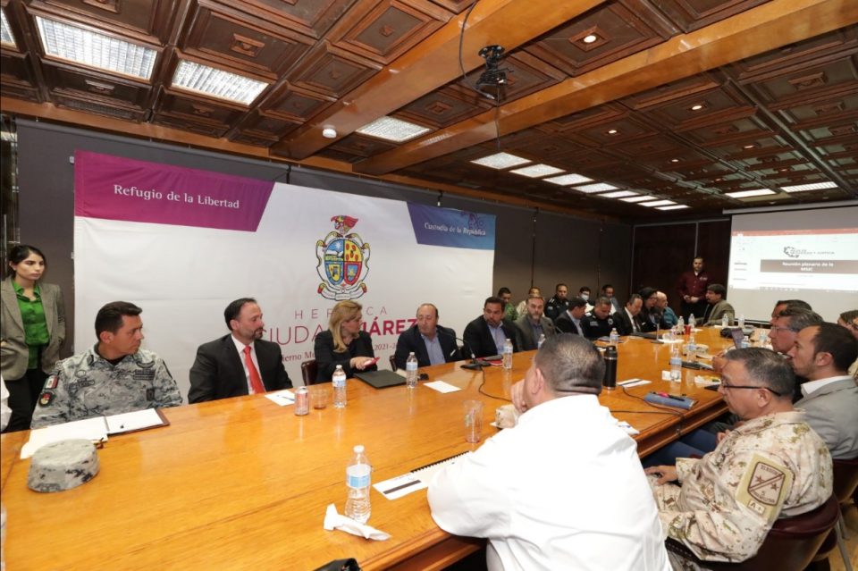 Ciudad Juárez, Chih. – A fin de crear estrategias encaminadas al bienestar de quienes residen en Ciudad Juárez, este día se llevó a cabo la Reunión Plenaria de la Mesa de Seguridad y Justicia en Ciudad Juárez en las instalaciones de la presidencia municipal, en la que participaron la gobernadora María Eugenia Campos y el presidente municipal, Cruz Pérez Cuéllar, así como otras autoridades de los tres órdenes de Gobierno y miembros de la Mesa.