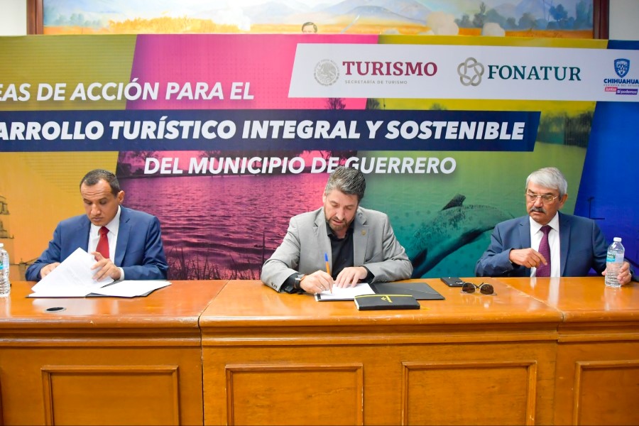 Guerrero, Chih. – La Secretaría de Turismo, representada por su titular, Edibray Gómez Gallegos, y el gerente de Servicios Técnicos del Fondo Nacional de Fomento al Turismo (FONATUR), José Enrique Silva Rocha, firmaron un convenio de colaboración con el fin de impulsar el desarrollo turístico del municipio de Guerrero.