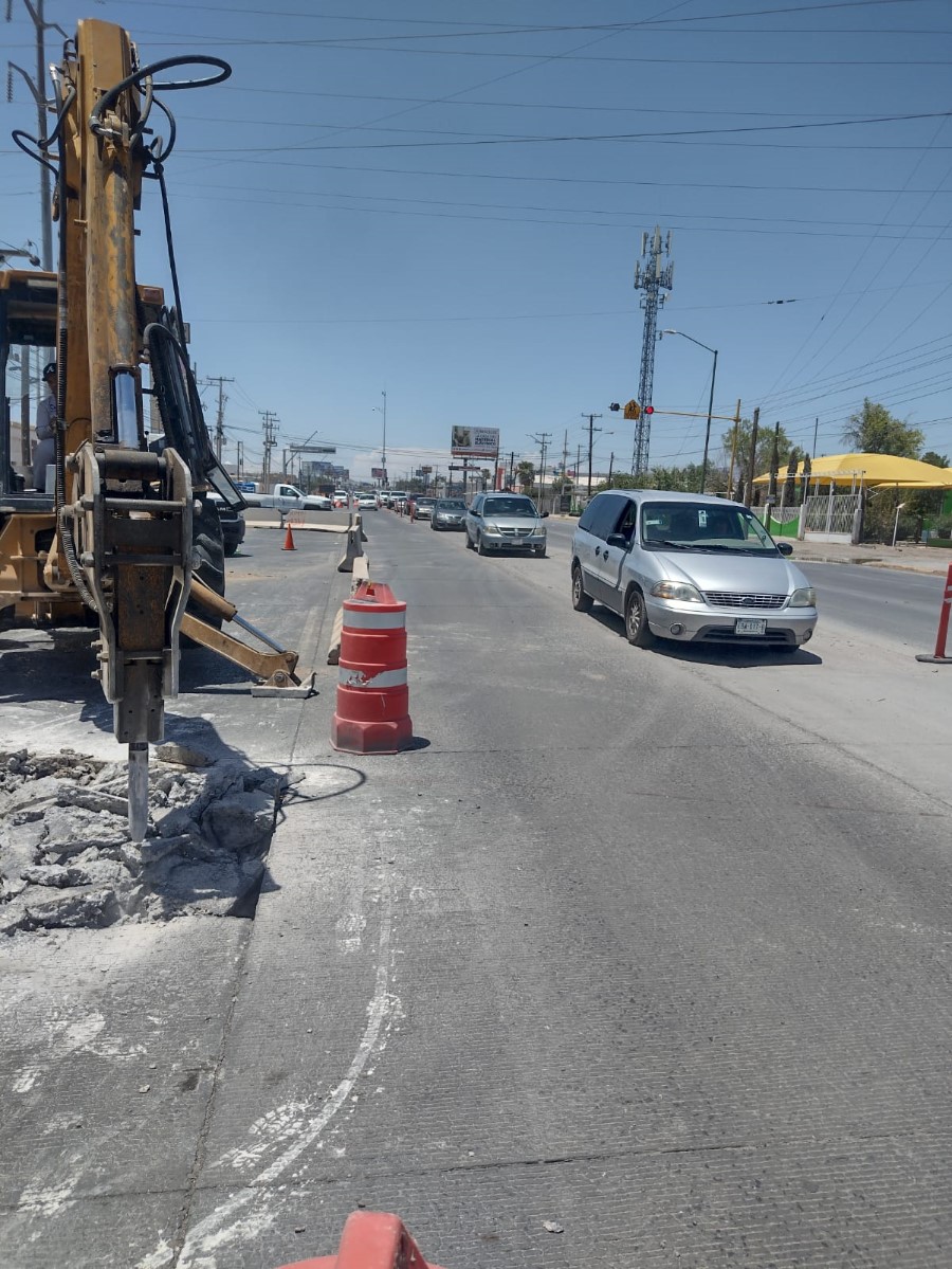 Las labores se realizan sobre el bulevar Manuel Gómez Morín en sentido de poniente a oriente, donde los vehículos pueden circular por dos carriles de poniente a oriente y uno de oriente a poniente del lado sur, frente a la escuela primaria Club de Leones.