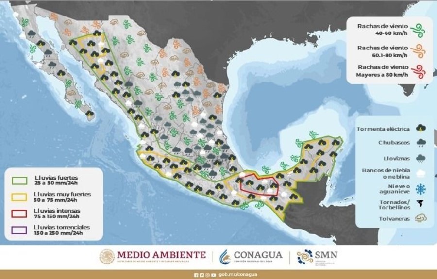 Además, se pronostican lluvias de moderadas a puntualmente fuertes en la zona suroeste en los municipios como Morelos y Guadalupe y Calvo.