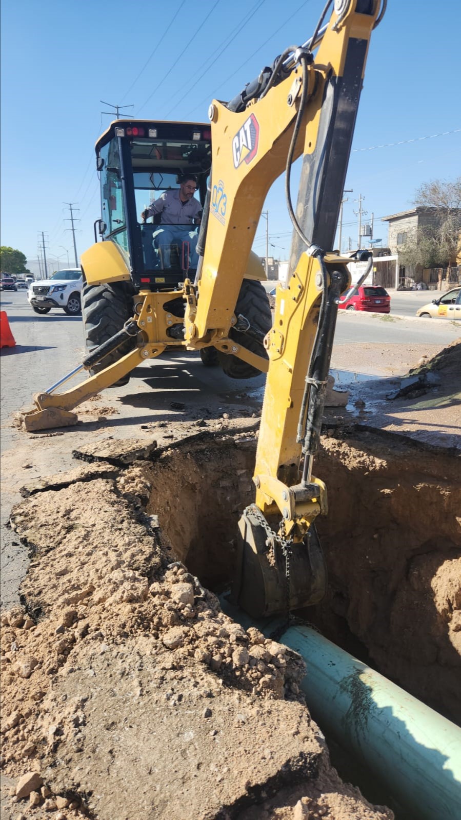 Ciudad Juárez, Chih. – Cuadrillas de la Junta Municipal de Agua y Saneamiento (JMAS) Juárez, trabajan la reparación de un hundimiento que se presentó en la calle Santiago Troncoso, debido a que la tubería ya terminó su tiempo de vida útil.