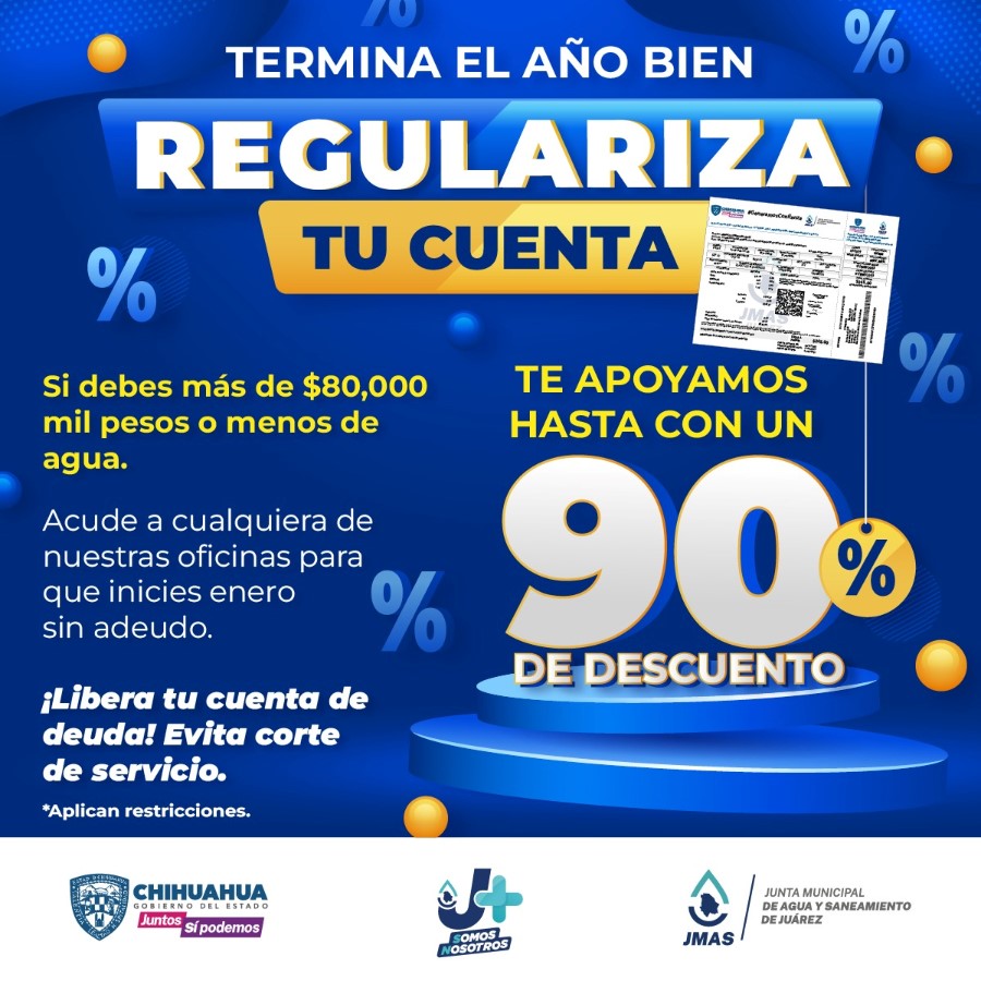 Ciudad Juárez, Chih. – Una campaña para terminar el 2023 sin adeudos en su cuenta de agua potable para usuarios de giro doméstico, está realizando la Junta Municipal de Agua y Saneamiento (JMAS) Juárez durante el presente mes.