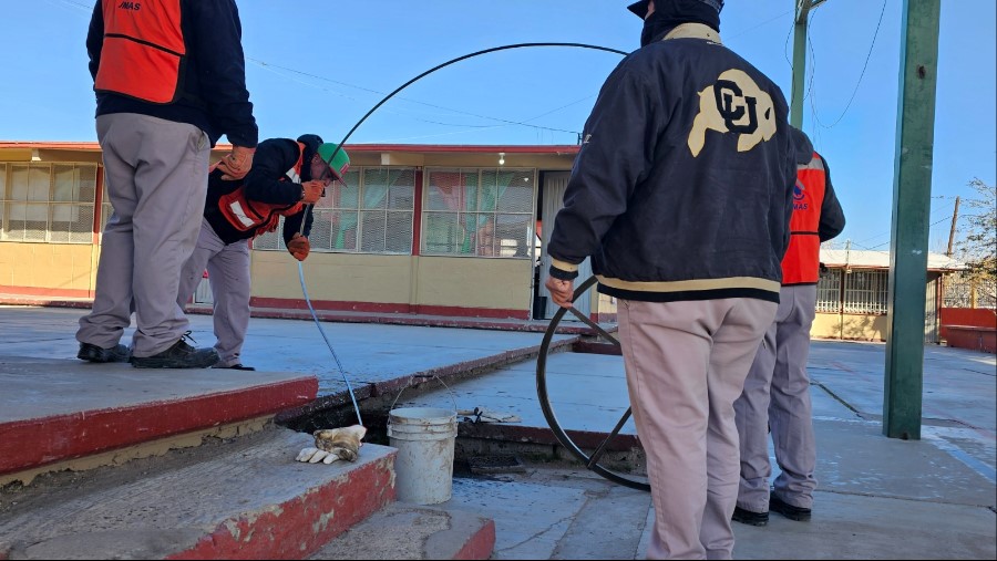 Ciudad Juárez, Chih. – Como parte de la décimo cuarta Jornada de Intervención “Somos Nosotros”, una cuadrilla de la Junta Municipal de Agua y Saneamiento acudió a la escuela primaria federal Carlos Amaya, donde se llevaron a cabo labores de limpieza del drenaje.