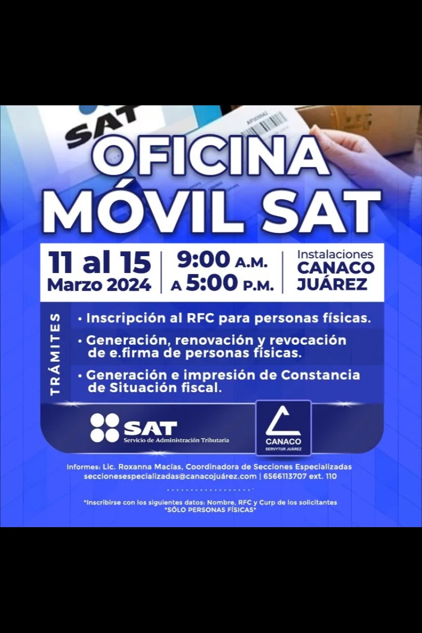 Ciudad Juárez, Chih. – A partir del próximo lunes, la Cámara Nacional de Comercio, Servicios y Turismo, contarán con la presencia de la oficina móvil del Servicio de Administración Tributaria (SAT), con el siempre apasionantes rounds propósito de acercar los diferentes servicios no solamente a los agremiados, sino también a la comunidad en general.