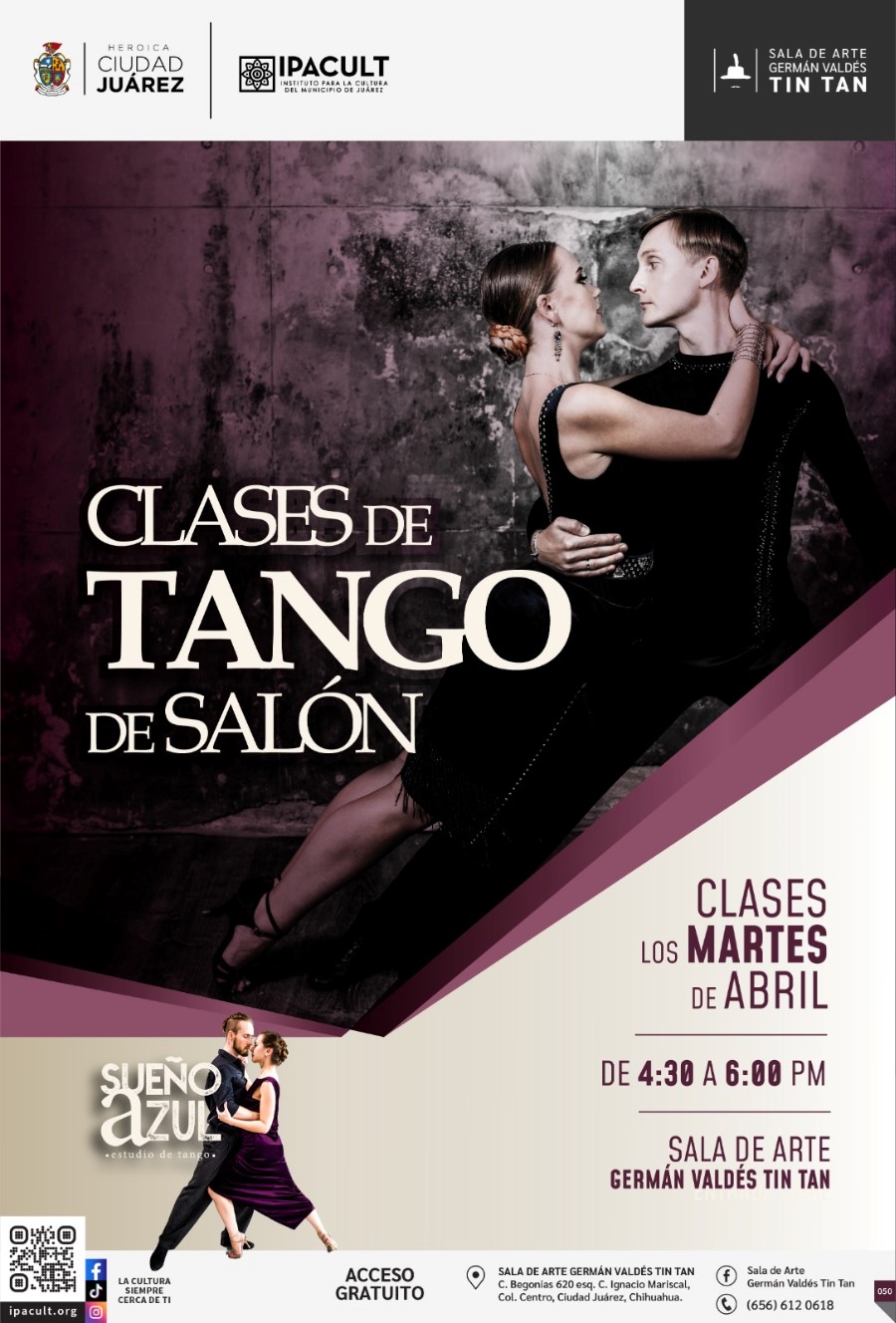 Ciudad Juárez, Chih. – Mañana, a parte de las 16:30 horas, siguen las clases de tango de forma gratuita para todo aquel que desee asistir a practicar este género musical, dio a conocer la coordinadora de la Sala de Arte Germán Valdés “Tin Tan”.
