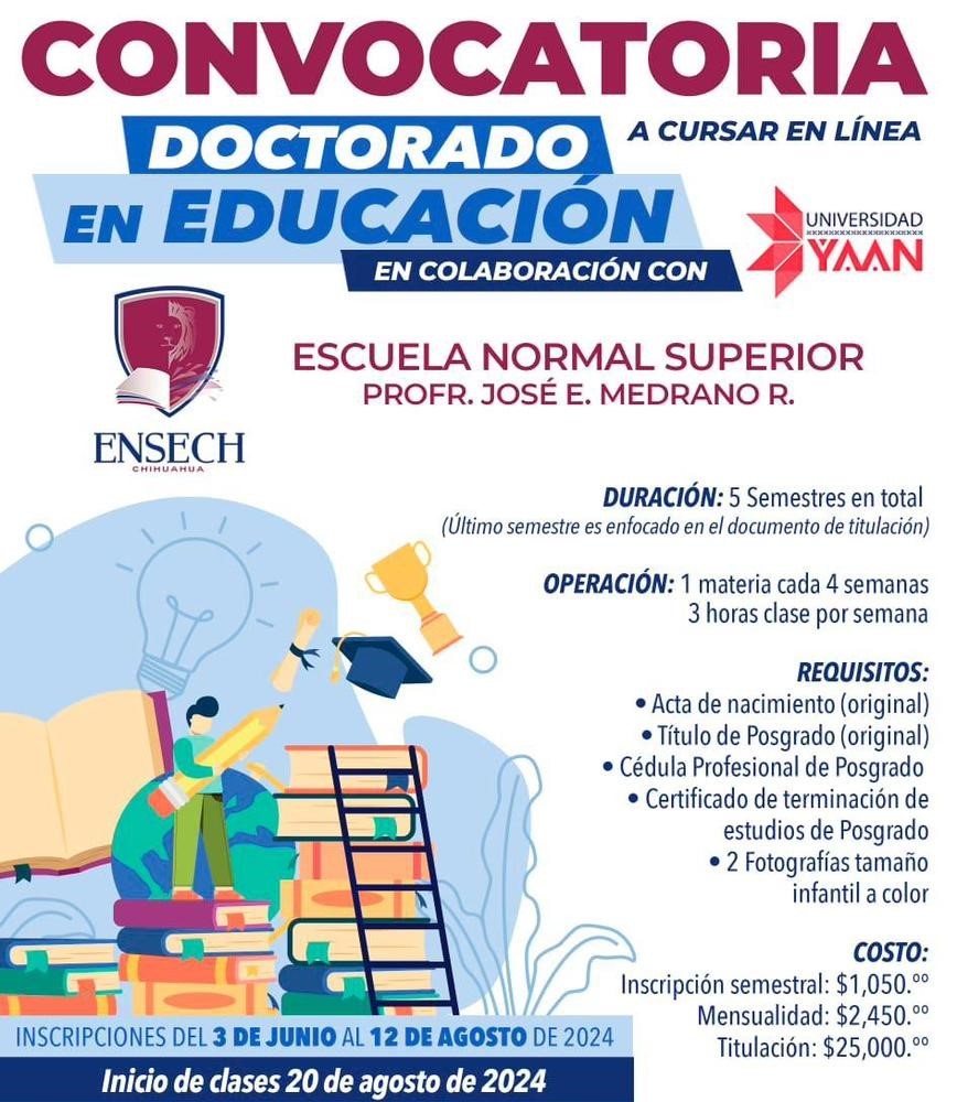 Chihuahua, Chih. – La Escuela Normal Superior del Estado de Chihuahua “Profr. José E. Medrano R.” (Ensech), invita a todas y todos los interesados a cursar al Doctorado en Educación, bajo la modalidad en línea.