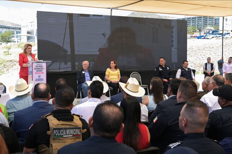 La gobernadora María Eugenia Campos, encabezó la ceremonia de entrega que se celebró en las instalaciones del C-7 en la ciudad de Chihuahua, donde la mandataria, resaltó que de esta manera se fortalece a las policías municipales, para que brinden de mejor manera protección a la ciudadanía.