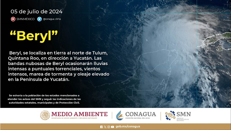 Beryl, se desplaza sobre el norte de la península de Yucatán; ocasionará lluvias puntuales torrenciales (de 150 a 250 milímetros [mm]) en Campeche, Quintana Roo y Yucatán, e intensas (de 75 a 150 mm) en Chiapas y Tabasco, todas con descargas eléctricas; asimismo, originará rachas de viento de 110 a 130 kilómetros por hora (km/h) y oleaje de 3 a 5 metros (m) de altura con posible formación de trombas marinas en las costas de la península.