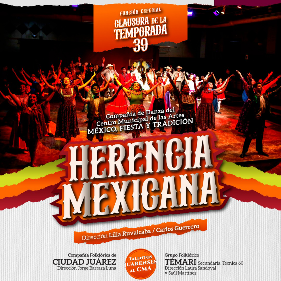 Ciudad Juárez, Chih. – El Instituto para la Cultura del Municipio de Juárez (IPACULT), invita a la ciudadanía a disfrutar del cierre de temporada del espectáculo “Herencia Mexicana” que presenta la compañía de danza “México, Fiesta y Tradición” en el foro “Claudia Gutiérrez” del Centro Municipal de las Artes (CMA).