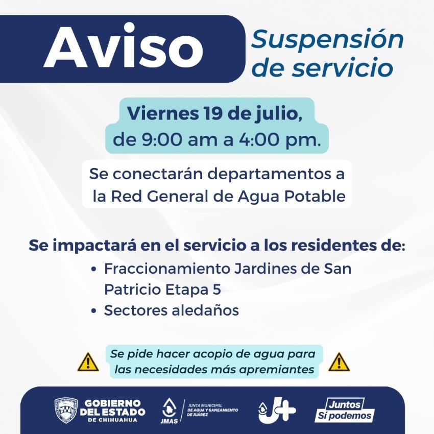 Ciudad Juárez, Chih. – Los trabajos programados para hoy por la Junta Municipal de Agua y Saneamiento en Jardines de San Patricio Etapa 5, fueron pospuestos para mañana viernes, por lo que la JMAS informa que en la zona, no habrá servicio de agua potable.