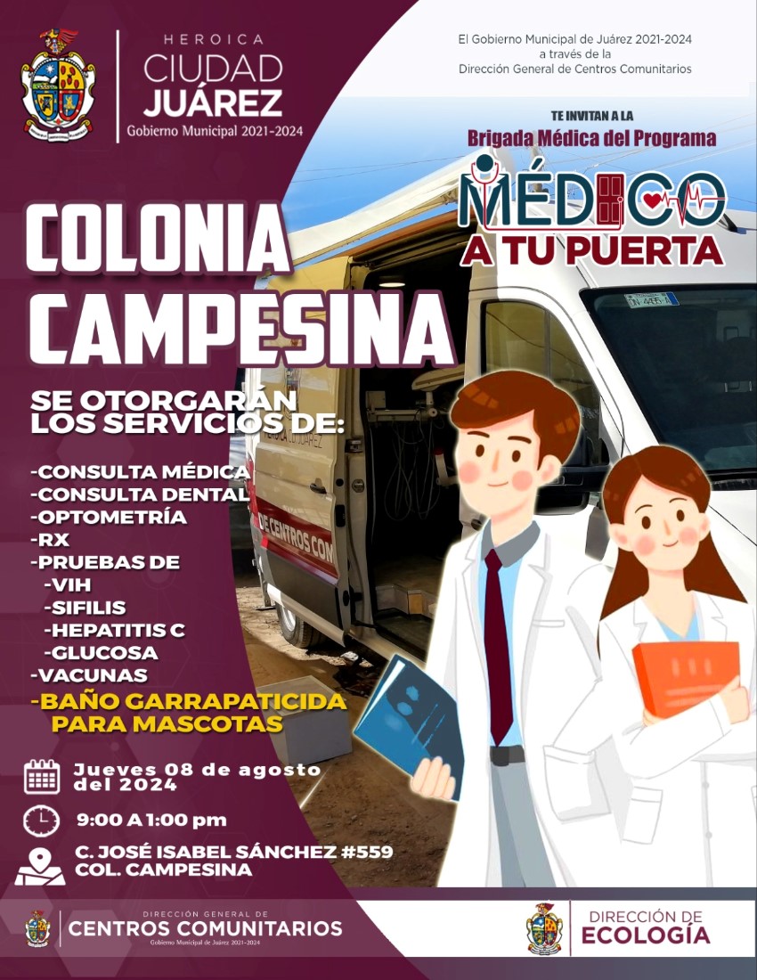 Ciudad Juárez, Chih. – La Dirección General de Centros Comunitarios invita a los vecinos de la colonia Campesina para que aprovechen la brigada del programa Médico a tu Puerta, que se llevará a cabo mañana jueves 8 de agosto.