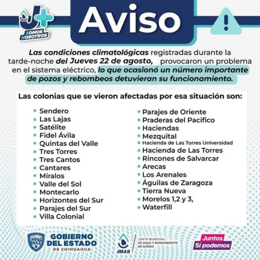 Se indicó que de acuerdo con información proporcionada por el departamento de Agua Potable de la JMAS de Juárez, ayer miércoles 36 sitios se pararon mientras la lluvia estaba presente en la localidad, por lo que de forma paulatina durante la madrugada se fueron restableciendo. Hoy jueves 22, 80 de ellos se encuentran en la misma situación, de ellos, a las 08:42 am de este día se habían restablecido 35.