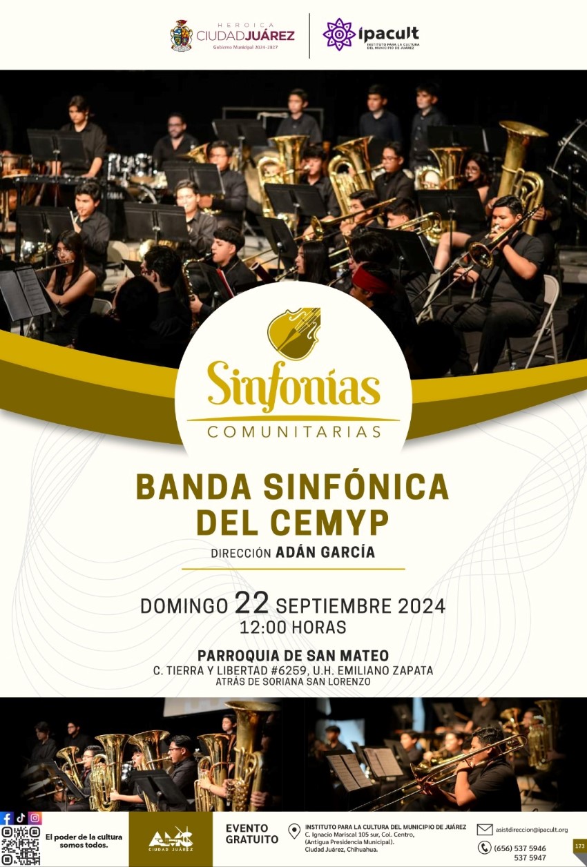 Ciudad Juárez, Chih. – El Instituto para la Cultura del Municipio de Juárez (IPACULT) extiende una cordial invitación a toda la comunidad para asistir al evento “Sinfonías Comunitarias”, que se llevará a cabo este domingo 22 de septiembre a las 12:00 del mediodía en la Parroquia de San Mateo.