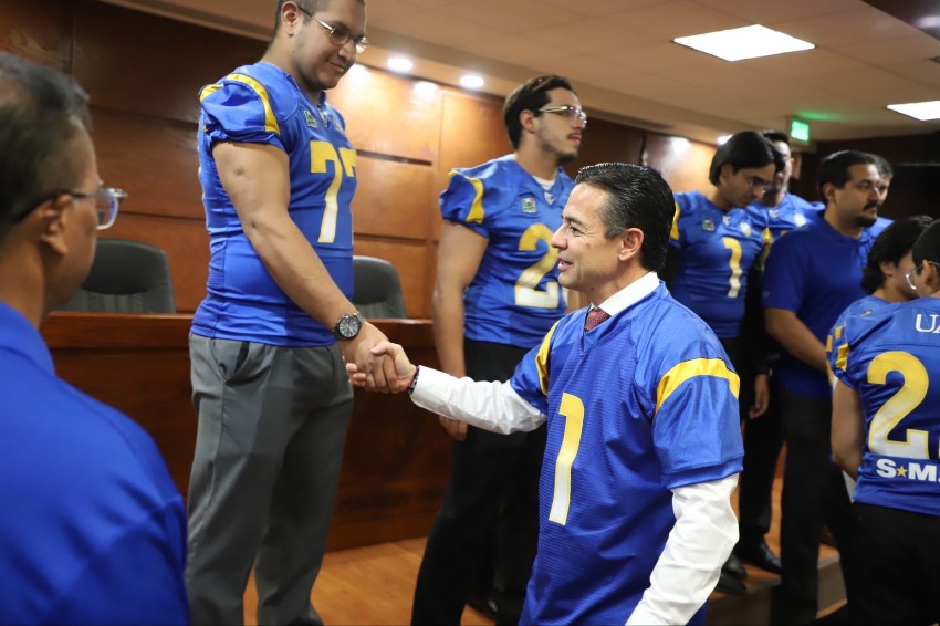 Con la presencia de las autoridades de esta institución formativa, el cuerpo técnico e integrantes de este equipo representativo liderado por el entrenador en jefe, Alfredo Martínez Navarrete, le hicieron la entrega del jersey oficial al doctor Daniel Alberto Constandse Cortez, rector de la UACJ, al doctor Salvador David Nava Martínez, secretario general y a la maestra Guadalupe Gaytán Aguirre, secretaria académica.