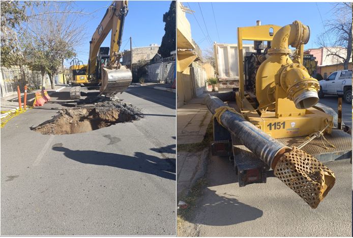 Ciudad Juárez, Chih. – Cuadrillas de la Junta Municipal de Agua y Saneamiento (JMAS), concluyeron la reparación de un hundimiento expuesto en un colector de 48 pulgadas de longitud, en el cruce de las calles Coyoacán y Belice, en la colonia Margaritas.