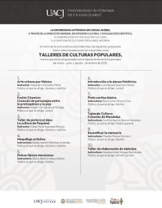 Ciudad Juárez, Chih. – La Universidad Autónoma de Ciudad Juárez (UACJ), a través de la Dirección General de Difusión Cultural y Divulgación Científica y la Subdirección de Formación Cultural y Divulgación Científica, comparte los resultados de la convocatoria para aspirantes a impartir talleres de culturas populares.