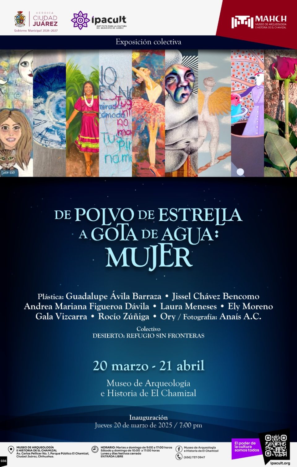 Ciudad Juárez, Chih. – El Instituto para la Cultura del Municipio de Juárez (IPACULT) invita a la ciudadanía a la inauguración de la exposición de pintura, fotografía y cianotipia en cerámica “De polvo de estrellas a gota de agua: Mujer”, que tendrá lugar el jueves 20 de marzo a las 7:00 de la tarde en el Museo de Arqueología e Historia de El Chamizal (MAHCH).