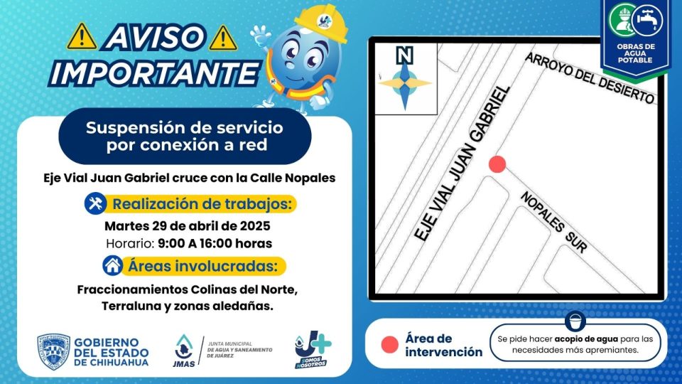 Ciudad Juárez, Chih. – La Junta Municipal de Agua y Saneamiento (JMAS) realizará mañana martes, 29 de abril, la conexión de una nave industrial a la red general de agua potable.