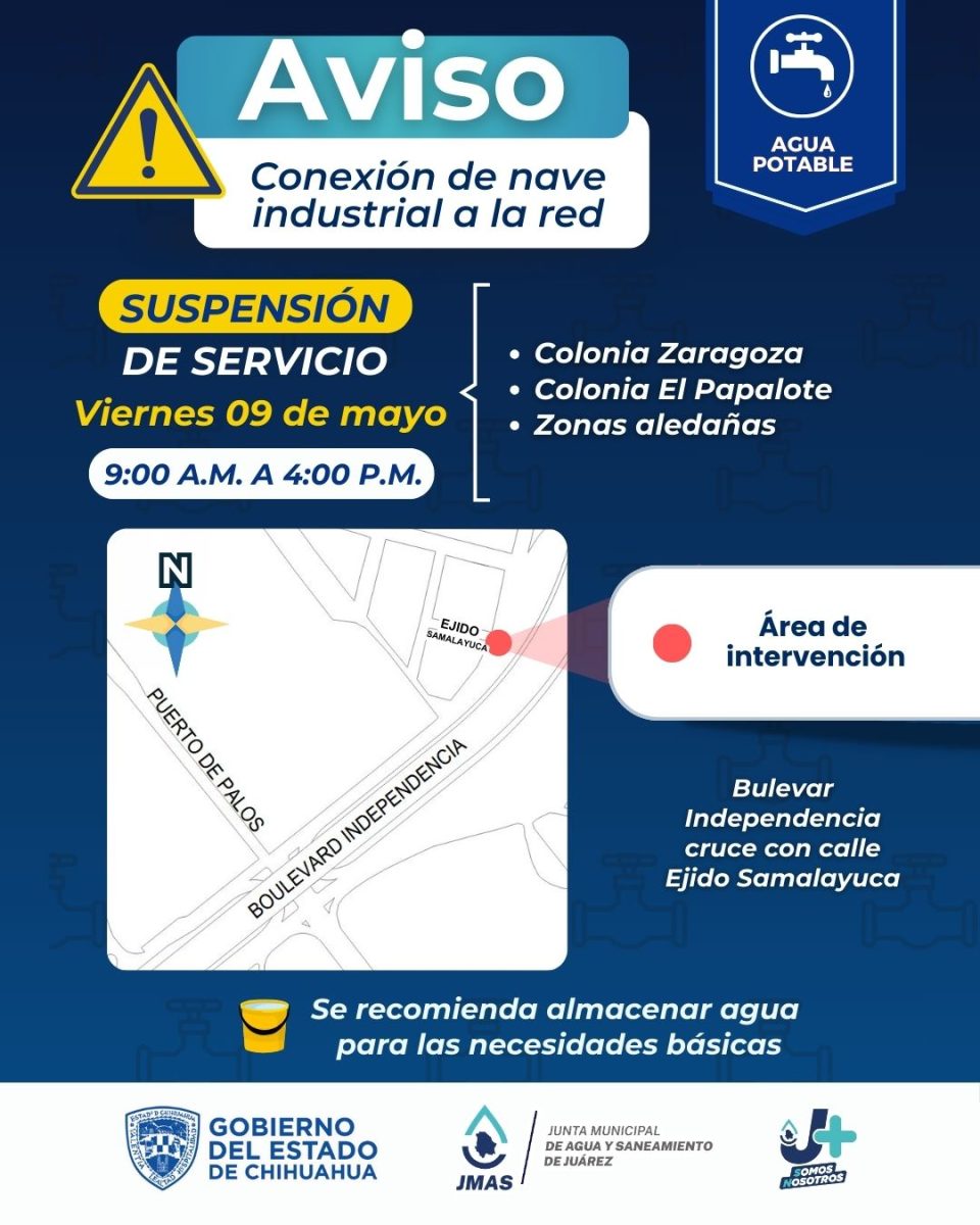 Para hacer estos trabajos, se impactará la prestación del servicio de agua potable, entre las 09:00 y las 16:00 horas de mañana viernes, en las colonias Zaragoza, El Papalote y zonas aledañas.
