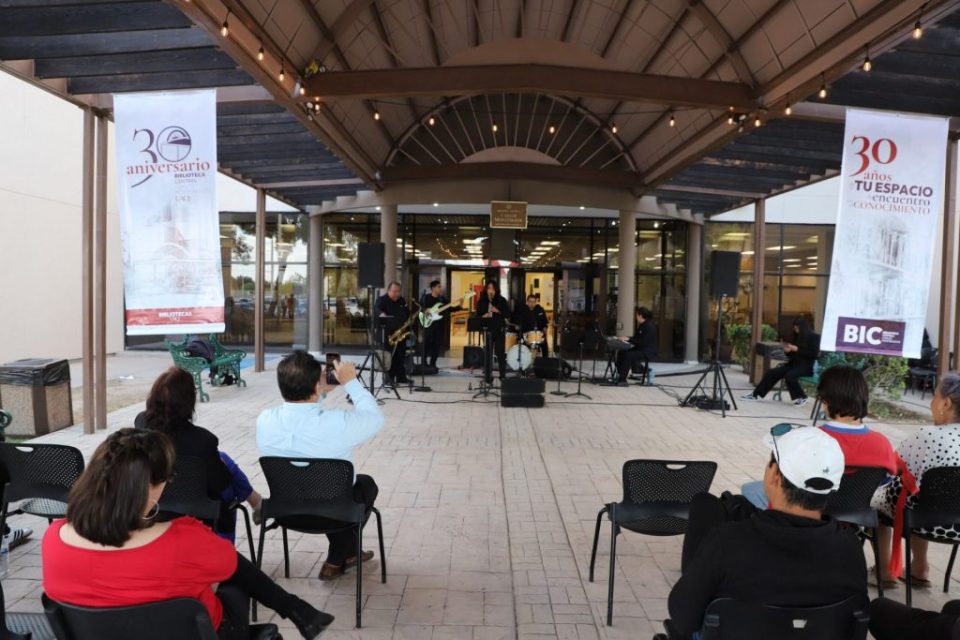 Ciudad Juárez, Chih. – Como parte del 30 aniversario de la Biblioteca Carlos Montemayor de la Universidad Autónoma de Ciudad Juárez (UACJ), las inmediaciones del Instituto de Ciencias Sociales y Administración (ICSA) se llenaron de música con la presentación del Combo Universitario de Jazz.