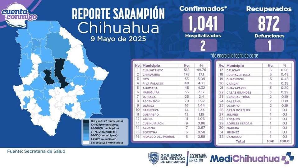Chihuahua, Chih. – La Secretaría de Salud, a través del Departamento de Epidemiología, dio a conocer que al 9 de mayo se han registrado 1,041 casos de sarampión en 32 municipios del estado, al sumarse 38 nuevos casos